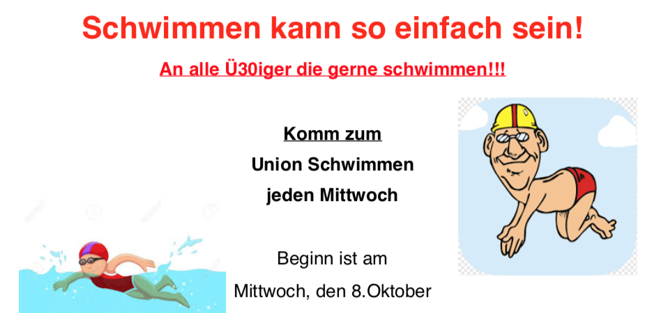 Schwimmen kann so einfach sein! - An alle Ü30iger die gerne schwimmen!!! Komm zum Union Schwimmen, jeden Mittwoch Beginn ist am Mittwoch, den 8.Oktober von 17:15-18:00 Uhr Bitte bring deine Badesachen mit! Bei Interesse bitte schnell anmelden bei der Kursleitung Frau Sabine Weidinger. (Tel.: 0650/8305503) Die Mitgliedschaft bei der Sportunion Eisenerz ist zwecks Versicherung